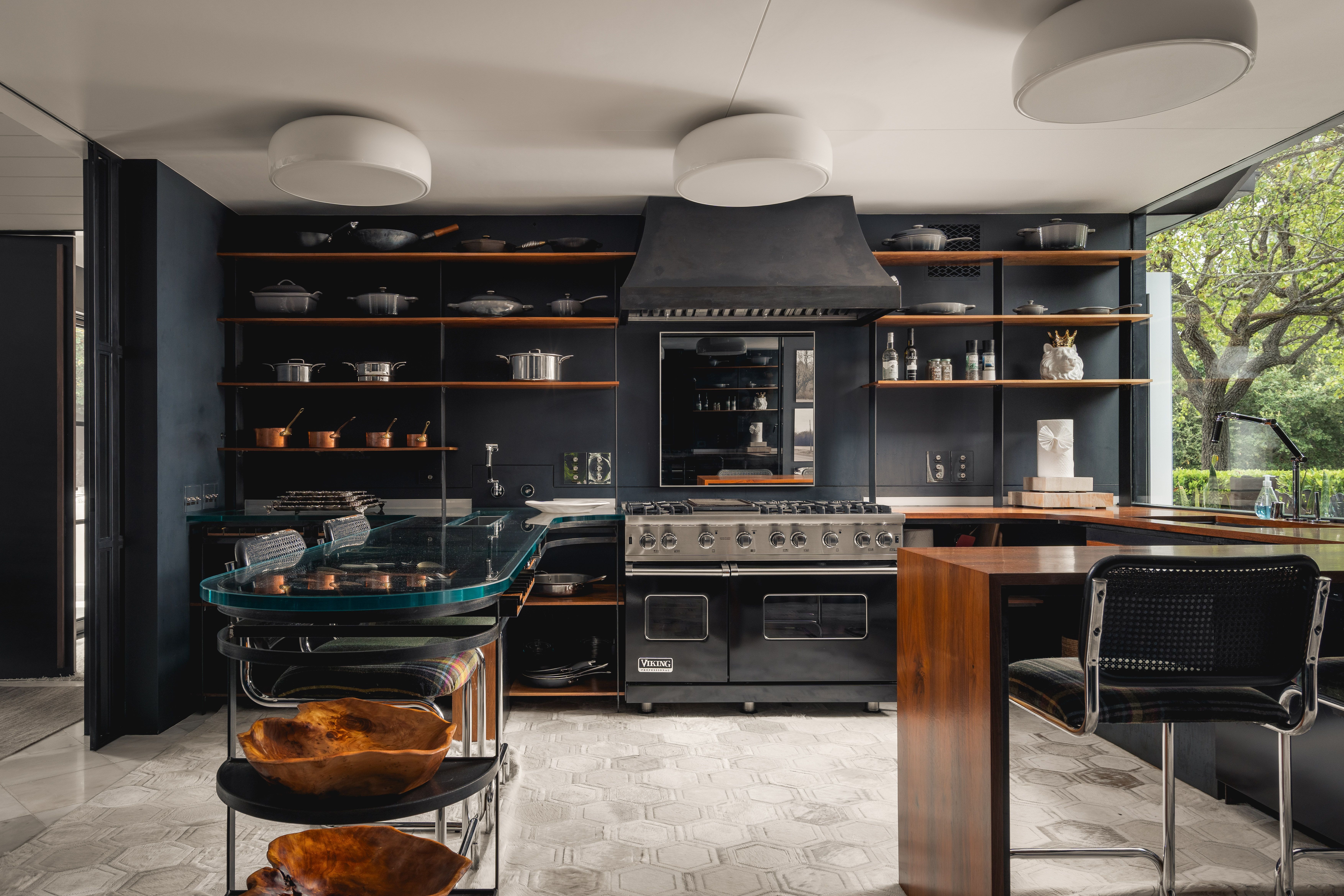 Inside the three-bedroom, three-bath main home, discover an idyllic balance of bold design and true comfort. Moody living spaces are thoughtfully arranged, while soaring vaulted ceilings, custom steel doors, geometric wall treatments, and whimsical wall coverings evoke both antique tapestry and fashionable camouflage. Rare details, including discontinued Hermès wallpaper, infuse the interiors with an air of exclusivity, while plush lounges and intimate alcoves create an inviting atmosphere that is playful and stylish.